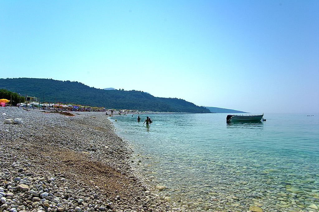 Livadhi Beach is one of the most popular beaches in Himarë. It has a long stretch of white stones, calm turquoise water, and plenty of space, even in summer. The beach is clean, wide, and known for its relaxed atmosphere, with sunbeds, restaurants, and also quieter areas where you can sit on your own towel.