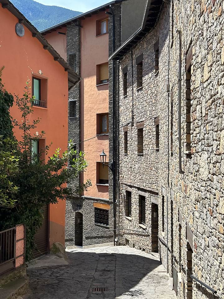 The streets of the historic centre are narrow, quiet, and full of charm. You will see a mix of old stone façades and newer buildings that preserve the traditional Andorran look, with wooden balconies and old-style lamps. The atmosphere is slow and peaceful, making it easy to enjoy the surroundings. Some streets gently slope up or down, and in a few places the view opens up, giving you a clear look at the mountains in the distance.