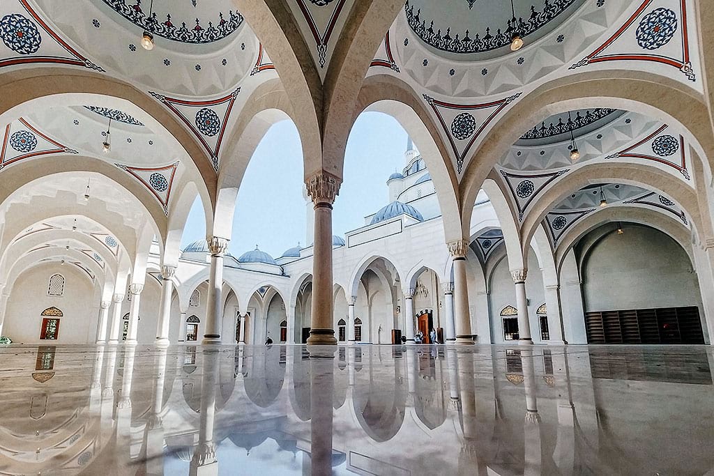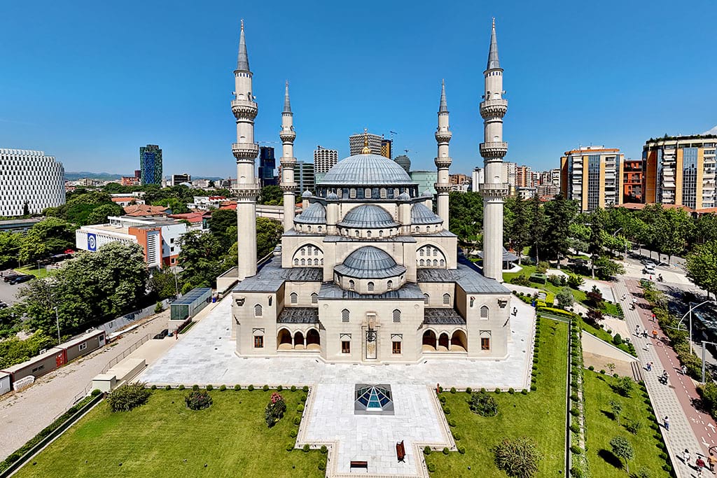 Namazgah Mosque is the largest mosque in Albania and one of the biggest in the Balkans. Opened in 2024, it was built with support from the Turkish government and can hold thousands of worshippers. The mosque has four tall minarets, a large central dome, and a spacious interior decorated with Islamic calligraphy and geometric patterns.