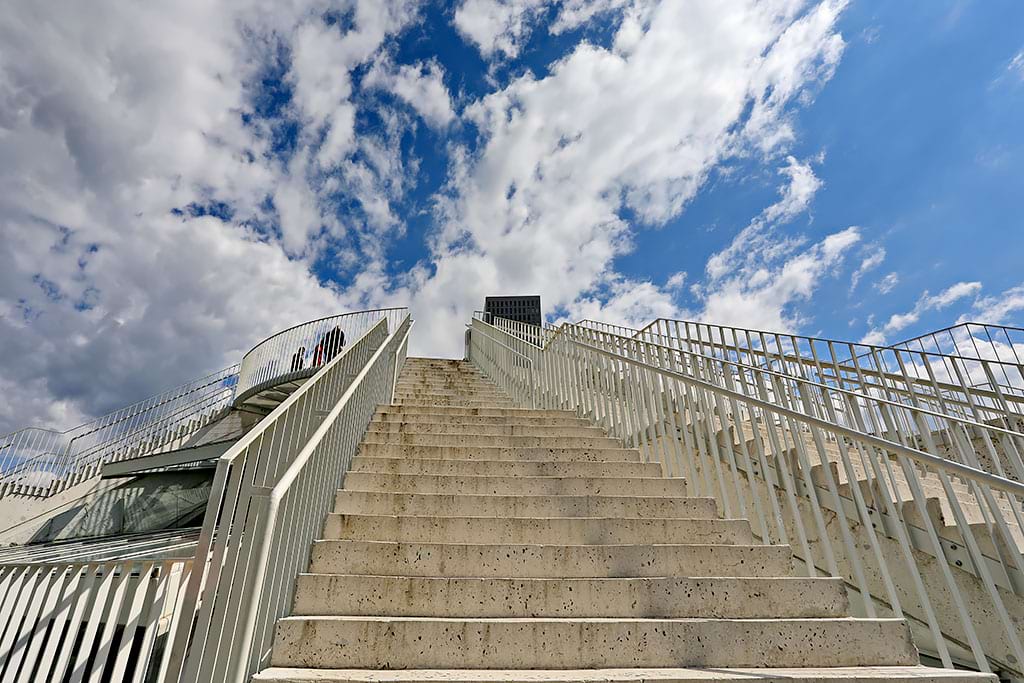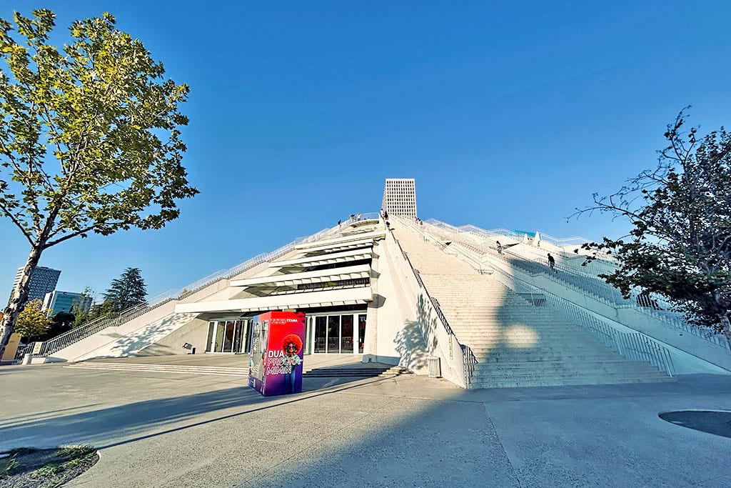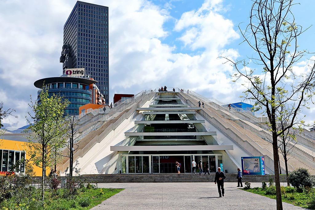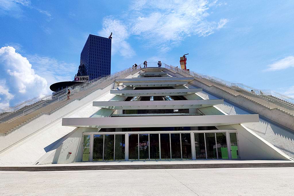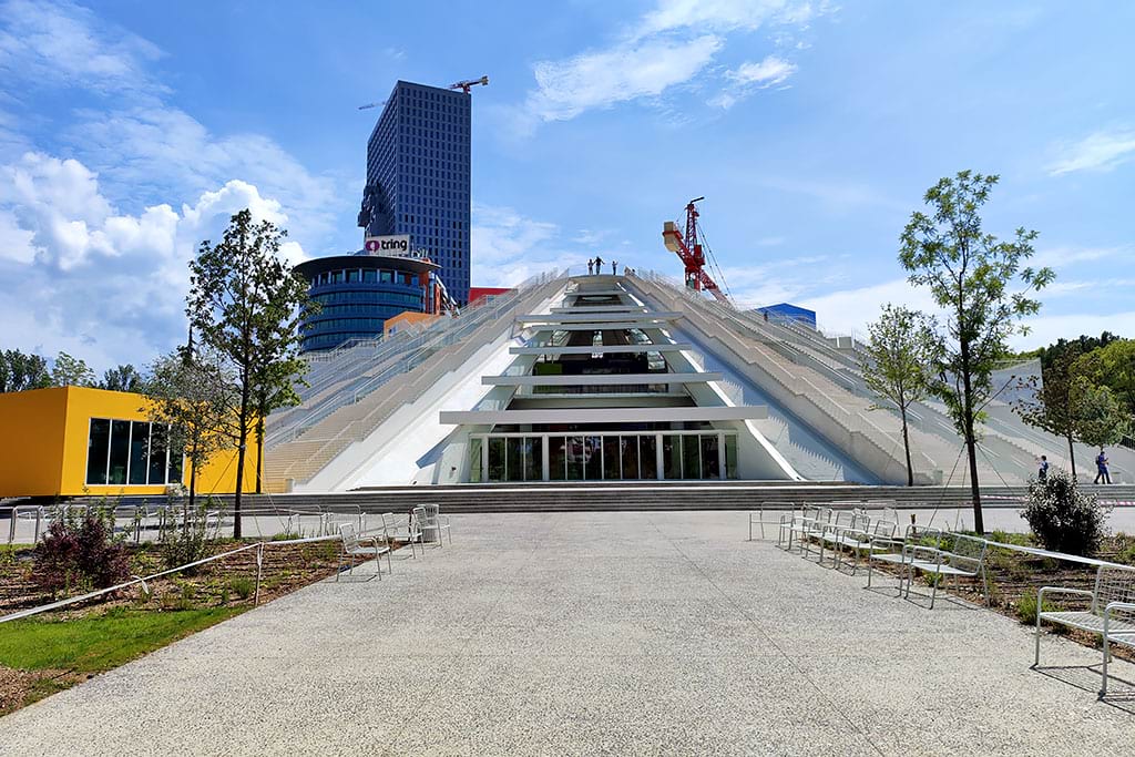 The Pyramid of Tirana was built as a museum for the communist leader Enver Hoxha. Later it became abandoned, but now it is renovated into a modern cultural center with stairs to climb to the top.