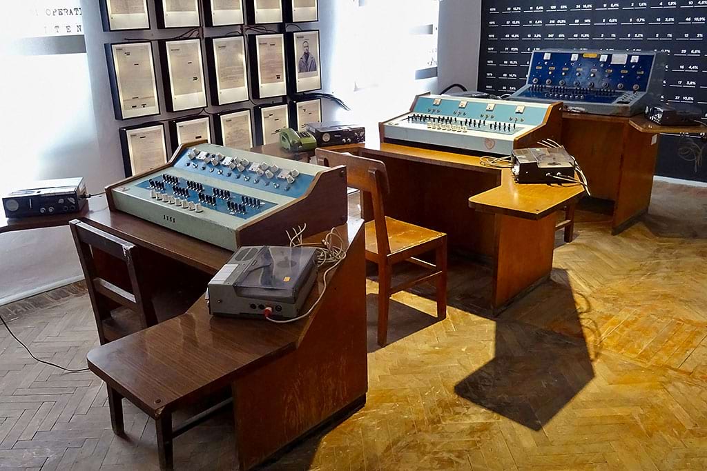 The House of Leaves is a museum about surveillance and secret police during communist times. It shows how people were watched, recorded, and controlled.